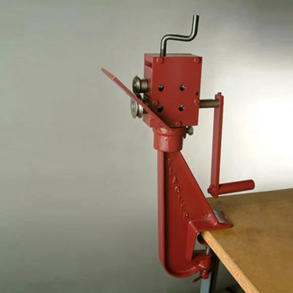 The Flagler Hand Flanger turns a 7/32" high flange on inside or outside radias small as 1 3/4". Relaseing top roll for the removal of a closed flange. This unit clamps to any shop bench and can be operated either left or right handed.