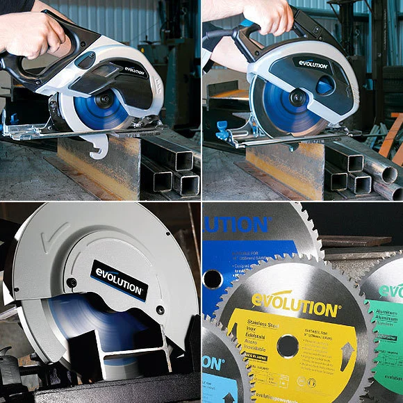 The Evolution EVOSAW180HD is a 7-1/4" TCT Industrial Circular Saw.The heavy-duty but extremely portable EVOSAW180HD has a new, improved, advanced design which allows it to outperform regular cutting saws.The steel blade will typically cut up to 262' of 1/4" steel plate before it needs to be replaced. It is ideal for cutting steel plate, box section, steel pipe, scaffolding, cladding and roofing.When cutting steel, this 7-1/4" saw leaves an instantly workable finish, having produced no heat, no burr and virtually no sparks (unlike alternative methods).The EVOSAW180HD features an easily adjustable depth of cut.The saw features a clear visibility panel to aid accurate cutting.It has a 0-45° bevel tilt that enhances the versatility of the saw.It includes a safety switch with overload protection.It features an auto-debris collection system, which collects chippings automatically.Optional blades are available to cut steel, stainless steel, aluminum and wood.The Evolution EVOSAW230 is a 9" TCT Industrial Circular Saw.The robust and highly durable STEELSAW230 is designed with advanced performance in mind.The steel blade will typically cut up to 262' of 1/2" steel plate before a replacement has to be made. It is ideal for cutting steel plate, box section, steel pipe, scaffolding, cladding and roofing.There is no heat while cutting, nor are burrs produced (and virtually no sparks), making it a superior way to cut steel when compared to other methods. The saw leaves an instantly workable finish in the material.A laser guide is included to aid accurate cutting.0-45° bevel tilt enhances the versatility of the saw.Easily adjustable depth of cut.Extremely portable.Heavy-duty.Safety switch with overload protection.Auto-debris collection system to automatically collect chippings during operation.Optional blades are available to cut steel, stainless steel, aluminum and wood.The Evolution EVOSAW380 is a 15" Steel Cutting Chop Saw. It is supplied with a 14" steel blade.This chop saw is faster and more accurate than an abrasive saw, while being safer and more economical as well. When cutting steel, the material has a workable finish. Virtually no heat, burrs or sparks are created, unlike inherently dangerous abrasive saws.The industrial quality mild steel blade can perform about 1000 cuts before a replacement is needed. It is ideal for cutting steel plate, square tube, angle iron, pipe, tube and metal roofing.Optional blades are available for cutting a full range of materials: steel, stainless steel, thin steel and aluminium.The fast action adjustable swivel vise enables cuts to be made from 0-45°.A high-torque gearbox reduces motor load and improves performance.A pull-out collection tray makes it easy to dispose of metal chips.